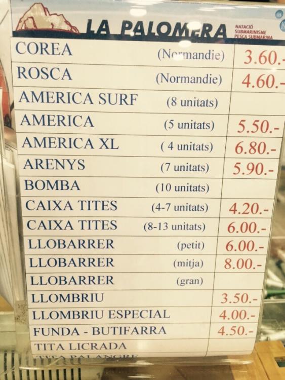 Пляж Йорета - это не основное место для охотников. Есть у нас места гораздо интереснее... Вас друг не туда отправил.... Пару раз нырял в такоооой бухте!!! Но там не половишь с донками(((( Корабликов много, но в основном летом, а рыбацкие больше в сторону Мальграт-де-Мар ходят, там судя по лоциям банка есть хорошая... По поводу червей. Выложу фото ценника из рыболовного магазина. Вот ассортимент. Из этого я использую: чаще всего, если ловить рыбу, более крупную чем дорадо, ARENYS. НА ПЕРВОМ МЕСТЕ... но бывают не всегда, их привозят местные рыбаки, если на море волна, их в магазине нет... Тогда использую AMERICA, но они не так стабильны по клёву. Иногда, в основном с ноября по май, использую TITES среднего размера, но это приманка из разряда "сработает-не сработает". По дорадо. Червяк № 1 - LLOMBRIU. От креветок, кальмаров, мидий, сардин, навахос и прочего ОТКАЗАЛСЯ!!!!!! Окончательно и бесповоротно!!!! В ноябре-декабре мастера ловят на кусок багета (причём только из DIA, почему-то... говорят самая прочная консистенция у него))))), но я пока не научился нормально его использовать, т.к. при силовом забросе он у меня слетает, а из-за приличной парусности наживки, летит недалеко ((( Но попадаются на хлеб экземпляры в 2 - 3 кг. Но повторяю, это больше исключение!!! Креветку обматывают либо леской 0,2, либо вообще белой ниткой, а потом через иглу надевают на крючок по принципу червяка.Не знаю... Повторяю.. Не использую... Ну не берёт ничего на неё в наших местах с берега... Почему - не знаю... Мелких креветок ведь у берега в камнях всегда куча, а они в любом случае - корм... Черви и только черви!!!)))) Но подборка и подгонка снасти для их использования (разные мелочи, но оказались важными) заняла года три... Ой, вру...))) Ловлю зимой на сардину кальмаров в заброс с берега на спиннинг...