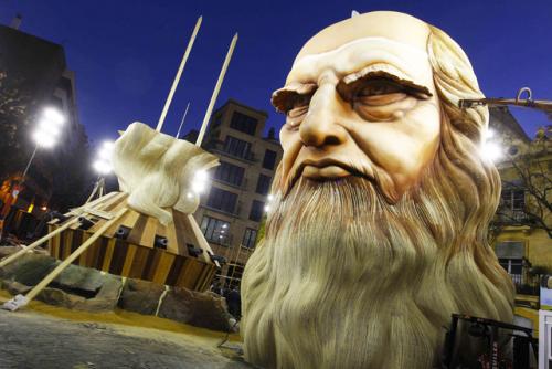 8. Огромная, десятитонная голова Леонардо да Винчи стала центральной фигурой на фестивале Фальяс в Валенсии. Этот памятник главе Фалья расположился в историческом центре города и сделан почти полностью из дерева (90%), что само по себе стало шагом назад к традиционныму мастерству и отходу, от теперь уже общепринятого пенополистирола. Размеры головы да Винчи невероятны: 23 метров в высоту, это так же высоко, как семиэтажное здание! В процессе ее постройки было использовано семь миллионов скоб, которые соединяют все части конструкции воедино. Мануэль Гарсия, художник, отвечающий за разработку и создание огромная головы, сообщил журналистам сегодня, что это "самая большая, самая сложная, но и самая зрелищная фигура", которую он когда-либо создавал. Одной из главных проблем была необходимость в использовании 35 000 кг балласта в основе фигуры, чтобы она не упала. Для того чтобы построить огромную копию головы да Винчи, Гарсиа использовал 20 кубометров сосны и тополя, пять человек собирали конструкцию в режиме "нон-стоп" в течение шестимесяцев. Если разложить фигуру в длину, она протянется на 240 километров.