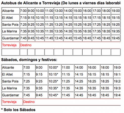Раньше пешком от ж/д до авто вокзала дойти можно было в Аликанте. Теперь автовокзал на берегу, новое здание. Так что пешком от ж/д вокзала не доберётесь. Берите такси. Меньше 5ти евров будет, в выходной день, может, 6. А расписание автобусов - здесь http://www.torrevieja.com/es/servicios/horario-de-autobuses/horario-autobuses-de-torrevieja-a-alicante.html