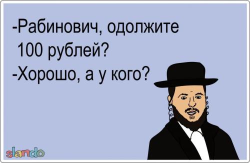 Нищий одинокий еврей, проживающий в коммунальной квартире со слепой матерью, в своих ежедневных молитвах просит Господа улучшить его жизнь. Наконец Бог решает удовлетворить его молитвы, исполнив только одно-единственное желание. Тот говорит: - Спасибо. Господи! Мое единственное желание: чтобы моя мама увидела, как моя жена вешает на шею моей дочери двадцати миллионное ожерелье в моем шестисотом "Мерседесе", припаркованном около бассейна рядом с моим особняком в Беверли-Хиллз! Бог: - Ни фига себе! Мне еще многому надо поучиться у этих евреев! У миллионера берут интервью: - Скажите, в чем секрет вашего успеха? - Терпение, мой друг, терпение. - Но я могу назвать тысячу вещей, где не поможет никакое терпение. - Например? - Носить воду в решете. - Вы не правы, просто надо взять решето и иметь терпение дождаться зимы.